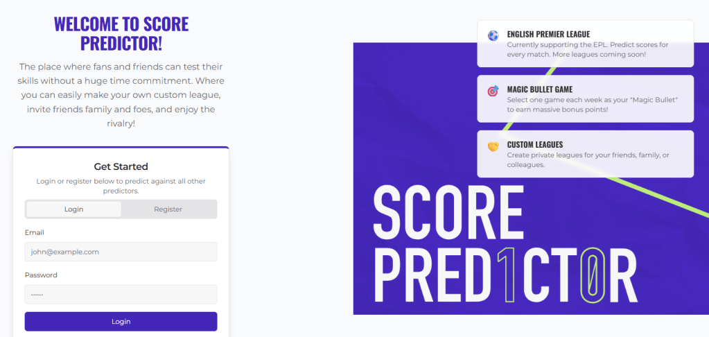 Brand new Score Predictor Web App – please share with friends and provide feedback. It is in demo/beta mode so will need a warm up to get going if it has been idle for a while but it is quite functional. I want you to register, make a league and get friends/fiends to join your league.